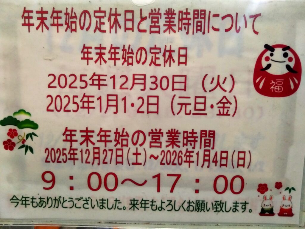年末年始は営業時間、定休日が変動しています。早目の閉店となりますので、よろしくお願い致します。